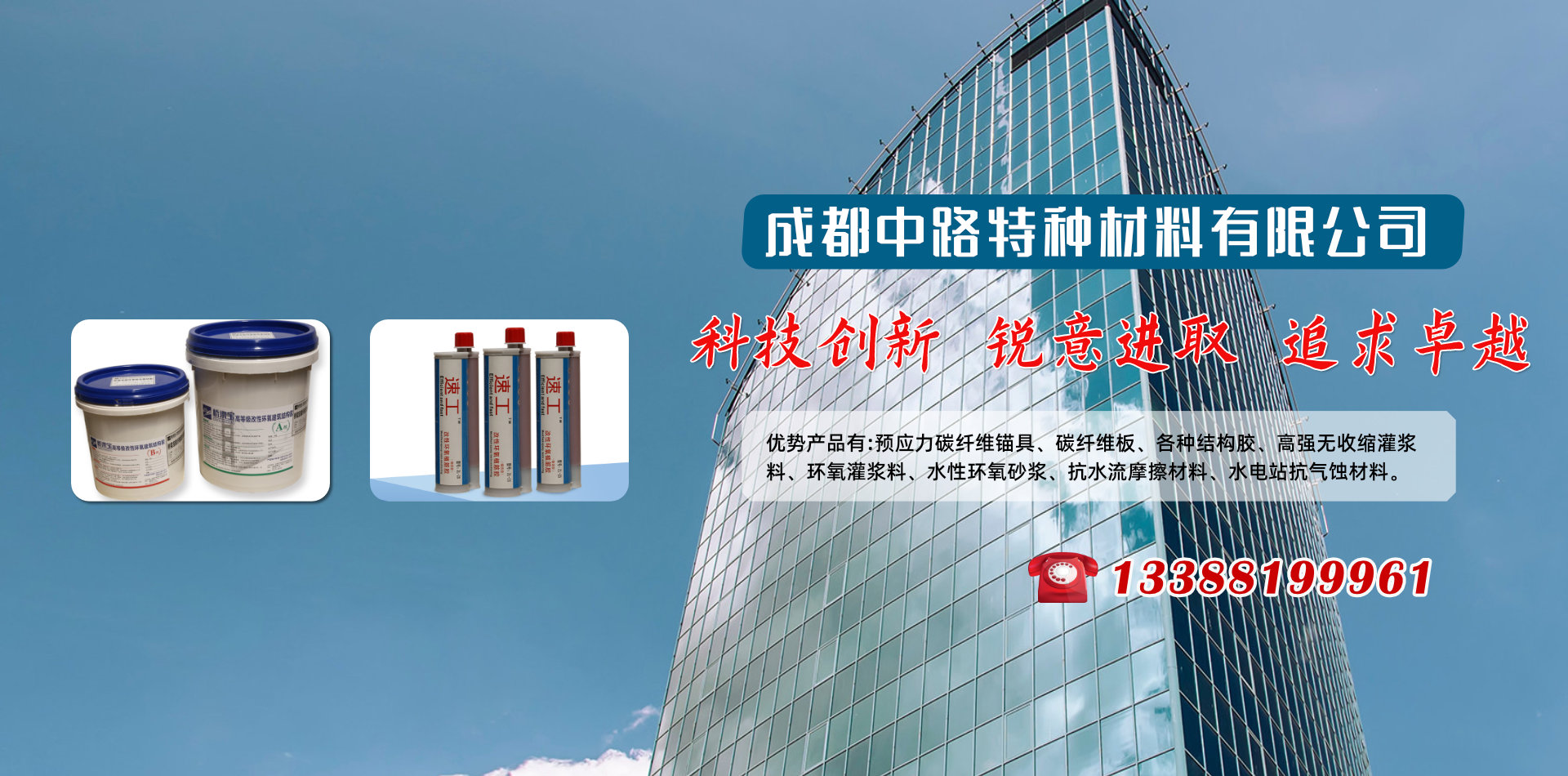 成都中路特種材料有限公司借助清華大學(xué)高分子材料學(xué)科、晨光化工研究院、西南交通大學(xué)、四川交通職業(yè)技術(shù)學(xué)院科研技術(shù)平臺(tái)成為一家集新材料研發(fā)、銷售、技術(shù)服務(wù)和施工于一體的專業(yè)服務(wù)公司,優(yōu)勢(shì)產(chǎn)品有:預(yù)應(yīng)力碳纖維錨具、碳纖維板、各種結(jié)構(gòu)膠、高強(qiáng)無(wú)收縮灌漿料、環(huán)氧灌漿料、水性環(huán)氧砂漿、抗水流摩擦材料、水電站抗氣蝕材料和研發(fā)各種特殊用途膠黏劑產(chǎn)品地處西南腹地成都,業(yè)務(wù)覆蓋四川各大中小城市、重慶、云南、昆明、新疆、西藏等區(qū)域。產(chǎn)品涵蓋各種加固施工材料、施工設(shè)備及施工配件,品牌有威士邦等aa進(jìn)口品牌,同時(shí)批發(fā)銷售國(guó)產(chǎn)高、中、低端品牌,為客戶提供全面參考。 成都中路特種材料有限公司為您提供加固行業(yè)的一站式服務(wù)! 如果您面對(duì)建筑物加固,不知如何下手,我們將針對(duì)您的項(xiàng)目情況,提供全面的技術(shù)指導(dǎo)咨詢,甚至為您量身定做加固方案;如果您面對(duì)項(xiàng)目要求,不知如何購(gòu)買加固材料,我們將根據(jù)您的需要,提供多種參考,從進(jìn)口品牌、國(guó)內(nèi)知名品牌到低端產(chǎn)品,一應(yīng)俱全; 如果你萬(wàn)事俱備,不知何處尋找施工人員,我們可以為您提供具有多年加固經(jīng)驗(yàn)的專業(yè)隊(duì)伍;中路特種材料致力于為客戶提供全方位的建筑物加固解決方案。 成都中路特種材料有限公司是一座橋,一座連接廠家與用戶的橋,以質(zhì)量求生存,以信譽(yù)圖發(fā)展,成都中路特種材料有限公司期望用真摯的服務(wù)筑起一座客戶信任之橋。   科技創(chuàng)新 銳意進(jìn)取 追求卓越!        熱忱歡迎業(yè)內(nèi)專業(yè)人士加盟合作!